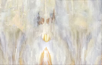 After a while, they step back. A portion of the wall perhaps six feet across and six feet high, irregular around the edges, now shows the woman frozen in the middle of a careful stride, baby in one arm and basket in the other, on her way down a steep sandy hill. She faces leftward; near the bottom of the hill, about three feet above the baseboard, a bit of distant blue water marks the horizon, and, above that, a lilac sky, softly clouded.